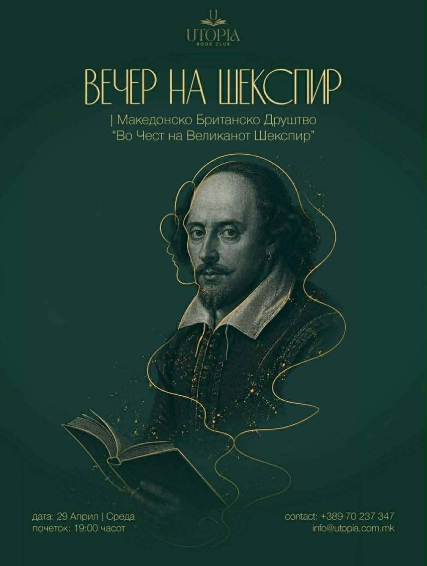 Годинава, Шекспировата вечер ќе се одржи во UTOPIA Book Club, на 29 април (среда), со почеток во 19:00 часот. Влезот е слободен.
