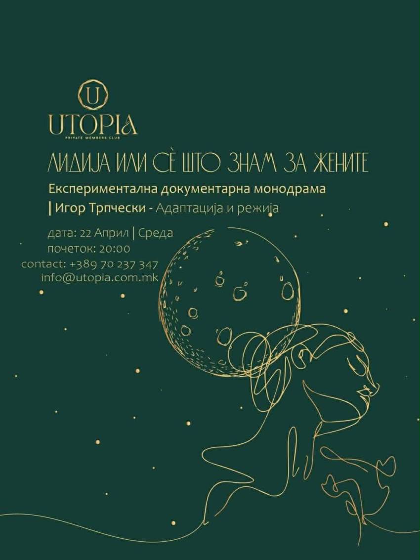 На 22 април, со почеток во 20:00 часот, во УТОПИА ќе се одигра монодрамата „Лидија или сè што знам за жените“, експериментална документарна форма базирана на поетскиот роман на Јанчовски.